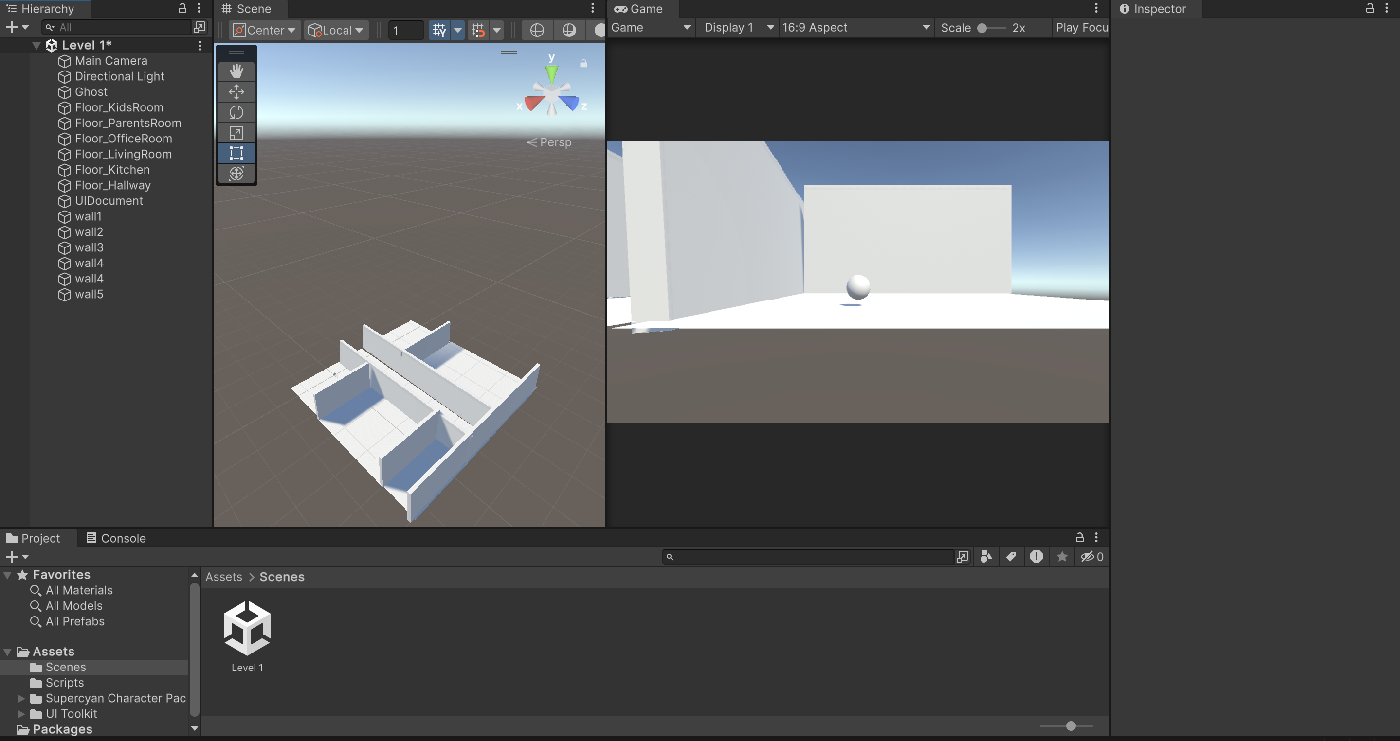 I began building the initial level layout of our haunted house prototype in Unity. I blocked out the main structural spaces, including key rooms like the kitchen, living room, parents’ room, and hallway, based on our Legos floorplan model, to start defining spatial flow and player pathing.