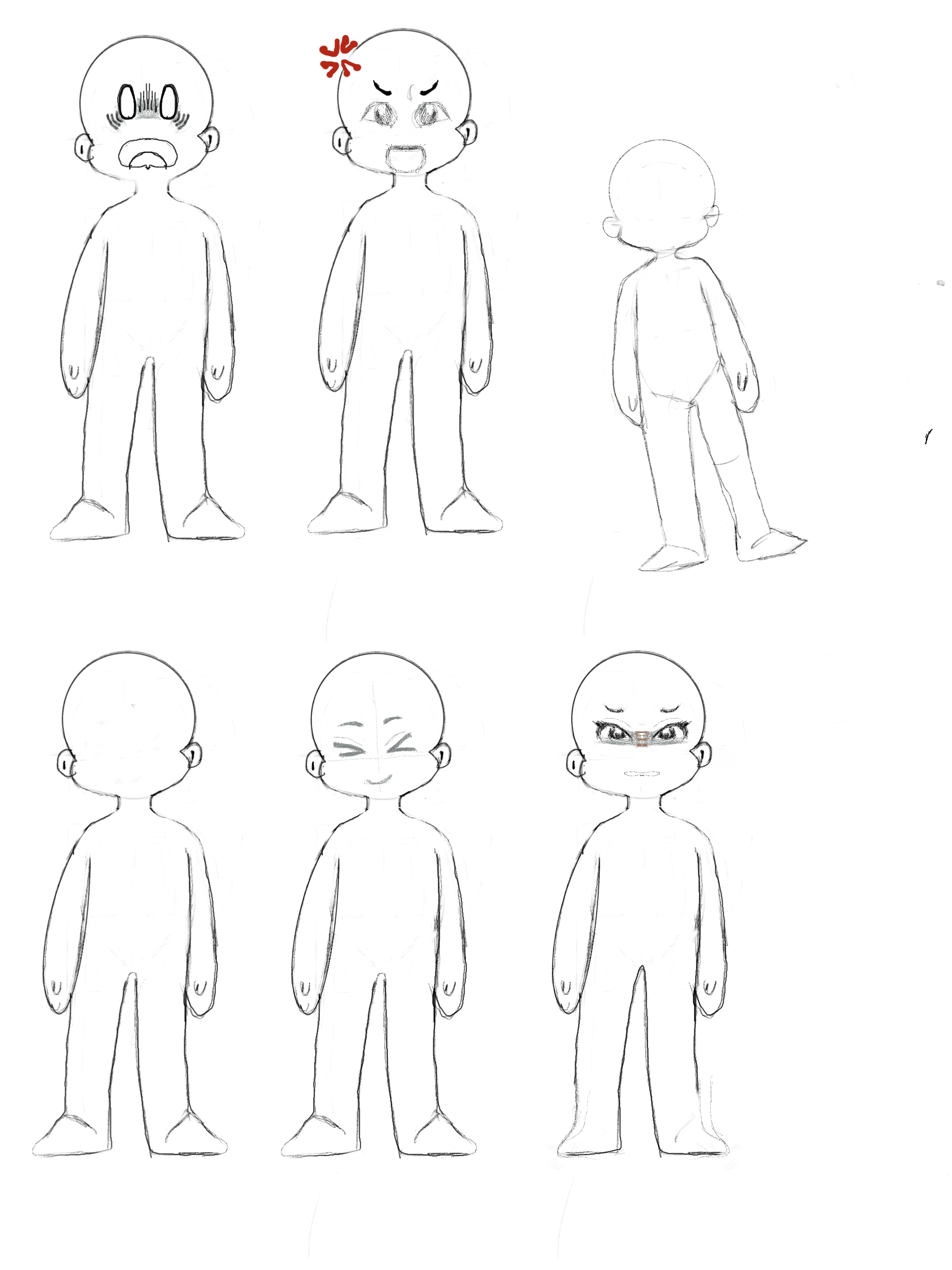 This was my first time attempting figure drawing, and chibis were no exception. I used references to understand their proportions and quickly sketched a character base with different expressions.