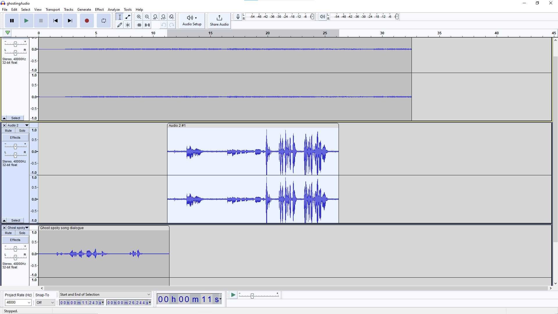 We ended up mostly scrapping the idea of using text box's to convey our dialogue. Instead, we decided we would voice act the characters. Lavanya will be the Ghost, I will be Timmy, and Sana will be the mom. For our first interaction, I put both Lavanyas and my lines into audacity. We also needed the music which was a bit harder to acquire. We found some copyright free stuff on YouTube but actually getting the mp3 file was a pain. I had to use the the Xbox game bar to record the YouTube video then convert that into a wav file for audacity. With everything in audacity I just made some edits to sound quality and location.