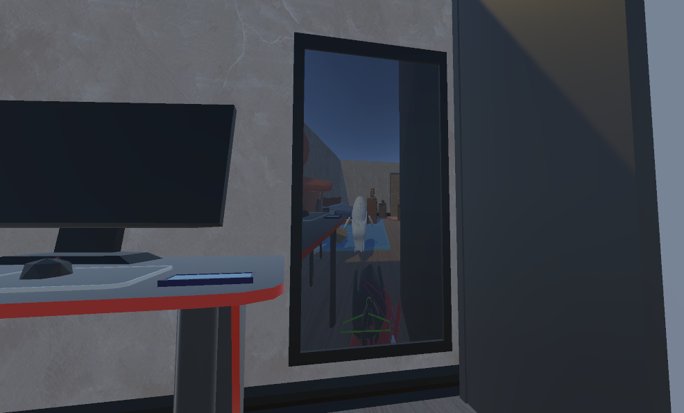 This was fairly straight forward. I made a new camera that is a child of the mirror asset, then made a new texture renderer. I then applied that texture to both the mirror asset and the camera. So now, the asset will display everything the camera sees. In the future we might have other smaller mirrors in the room.